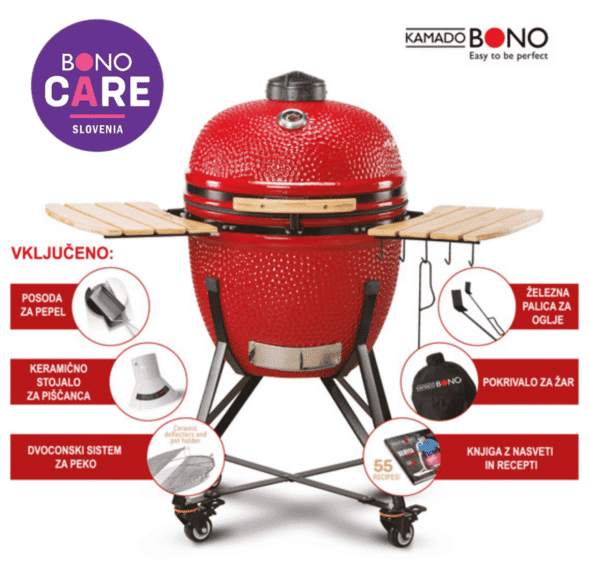 V osnovnem kompletu dobite: keramični žar Kamado BONO "GRANDE, stojalo, stranske mizice s kljukami za obešanje, inovativno tesnilo iz steklenih vlaken, ki poskrbi, da vroč zrak in dim ne uhajata skozi žar, dvo conski sistem za peko, dve stranski deflektor plošči, nosilec za Kazan posodo, keramično stojalo za piščanca, litoželezno palico za odstranjevanje pepela in zaščitno pokrivalo za žar.